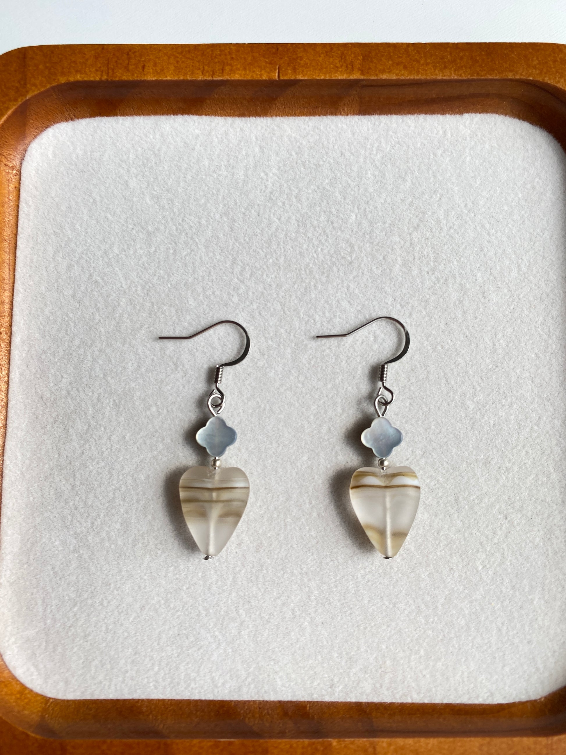 Heart-shaped matte beads combined with black four-leaf clover seashells—exuding beauty and elegance.