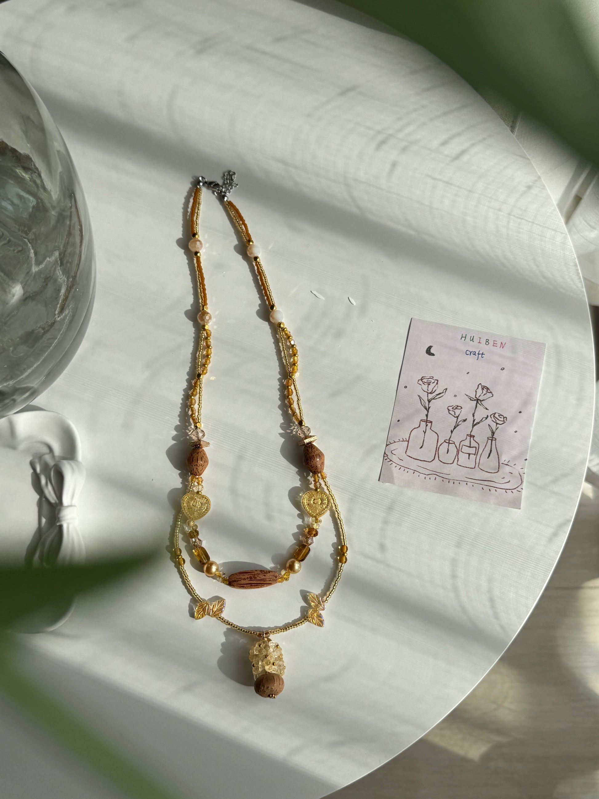 Double-layered necklace: pendant is a flower-clustered bouquet with a wooden vase. The main chain also has 3 wooden beads + 2 large heart glass beads—super atmospheric, shiny and classy.