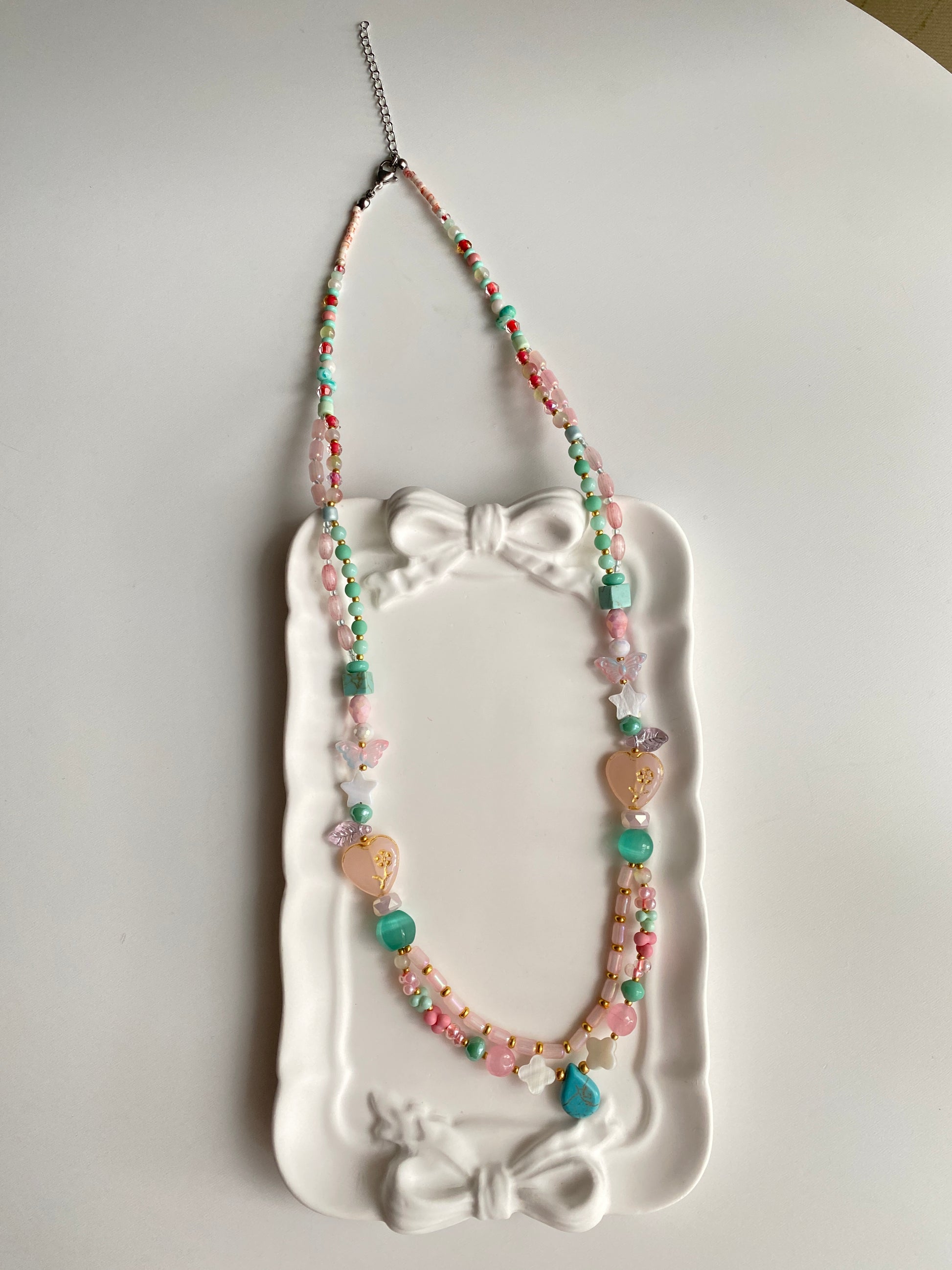 Double-layer Long Sweater Necklace: A fusion of Ethnic and Cute styles, featuring butterfly, heart & star motifs—perfect for autumn-winter layering.