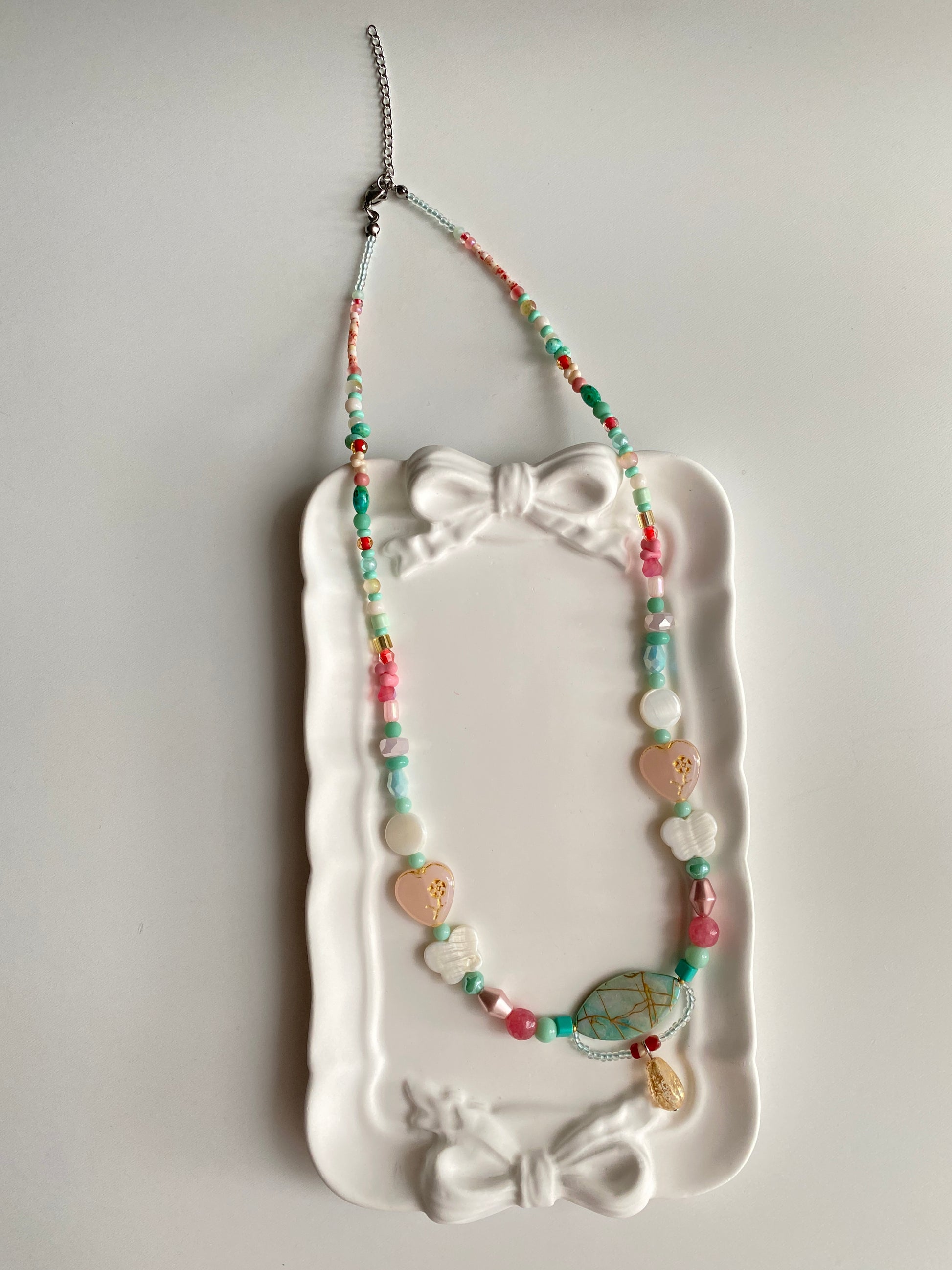 A playful-ethnic necklace where cuteness meets cultural flair. The chain features a pink-and-white color scheme with heart and butterfly elements, while the pendant exudes ethnic charm: a green shell suspending a melon-seed-shaped bead for a mixed-style vibe. Necklace Length:21.2 inches (54cm) + 1.97 inches (5cm) extension chain