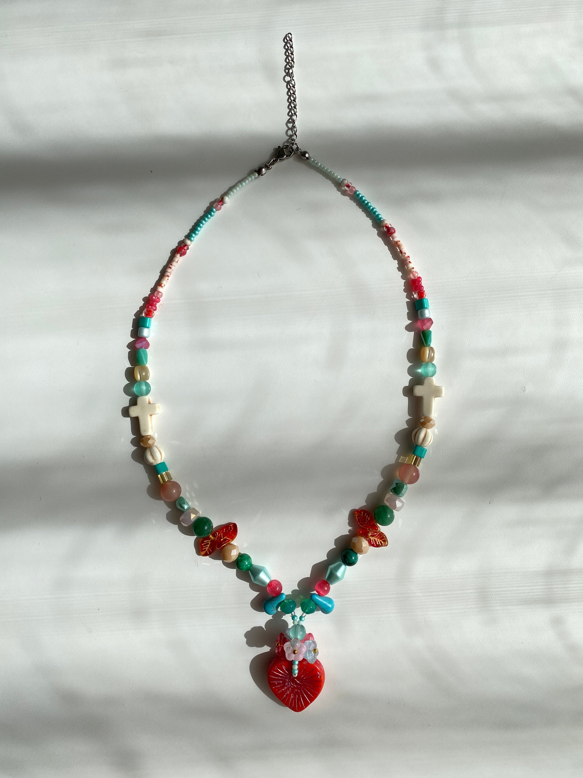 A lucky necklace in rich red and powder blue, symbolizing 'a flower blooming in your heart'—a daily wish for good mood and endless joy.