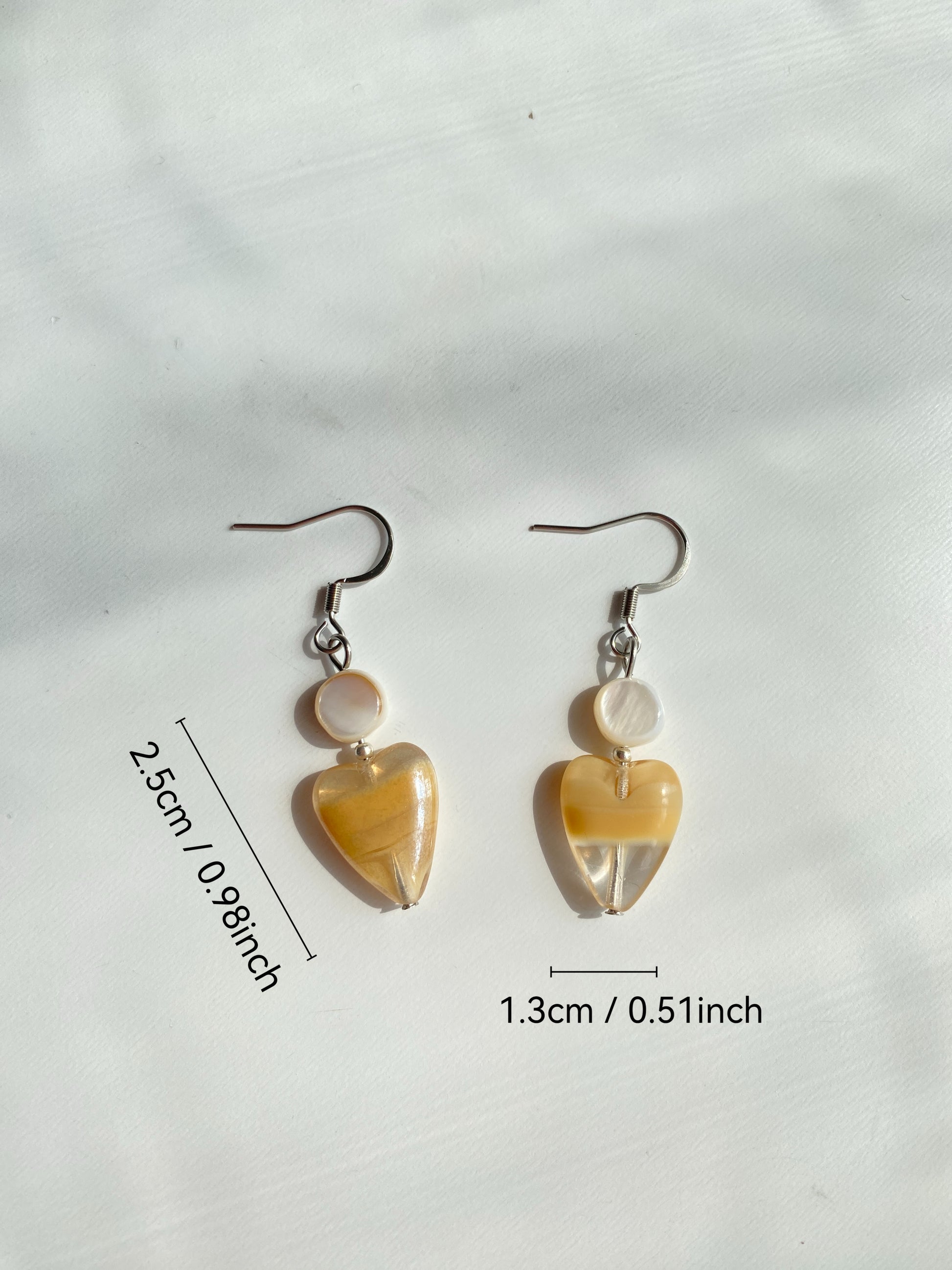 Natural seashells paired with heart-shaped beads—adorable and whimsical. Materials: glass beads, stainless steel metal, natural seashell