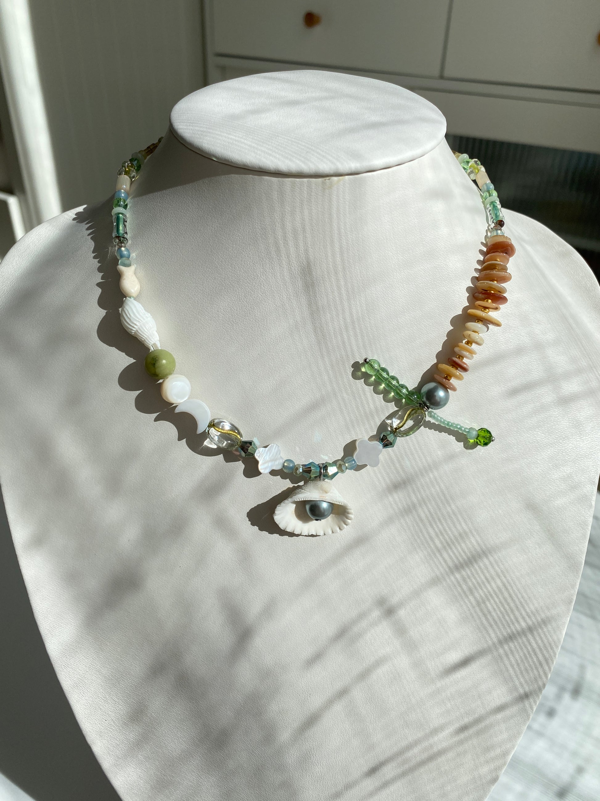 With conch shells and seashells in four-leaf clover and moon designs, this vacation-style necklace is simple but not simplistic.