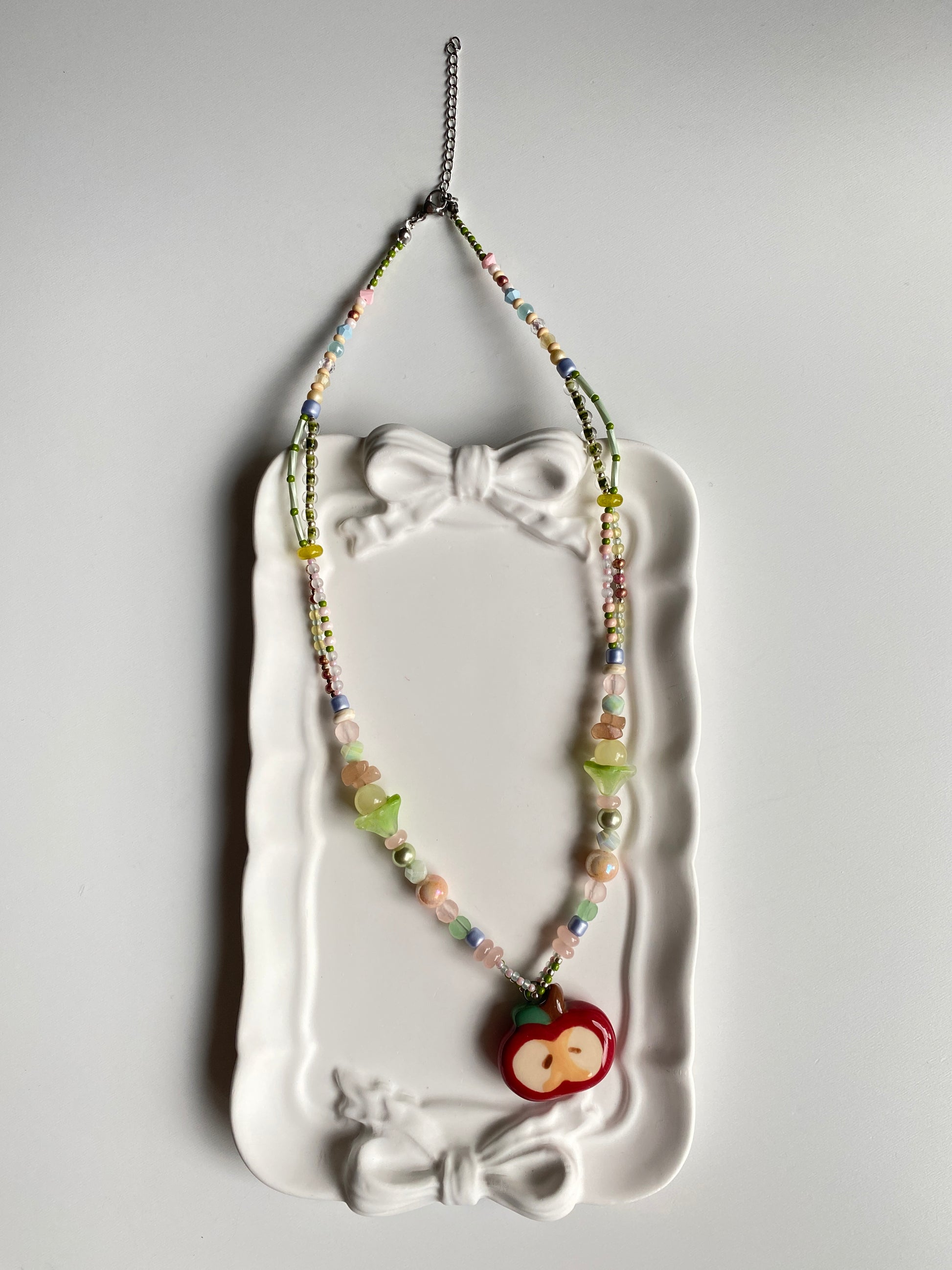 The necklace features a main color scheme of turquoise, light yellow, and pink seed beads, with a red apple ceramic pendant that exudes childlike wonder.