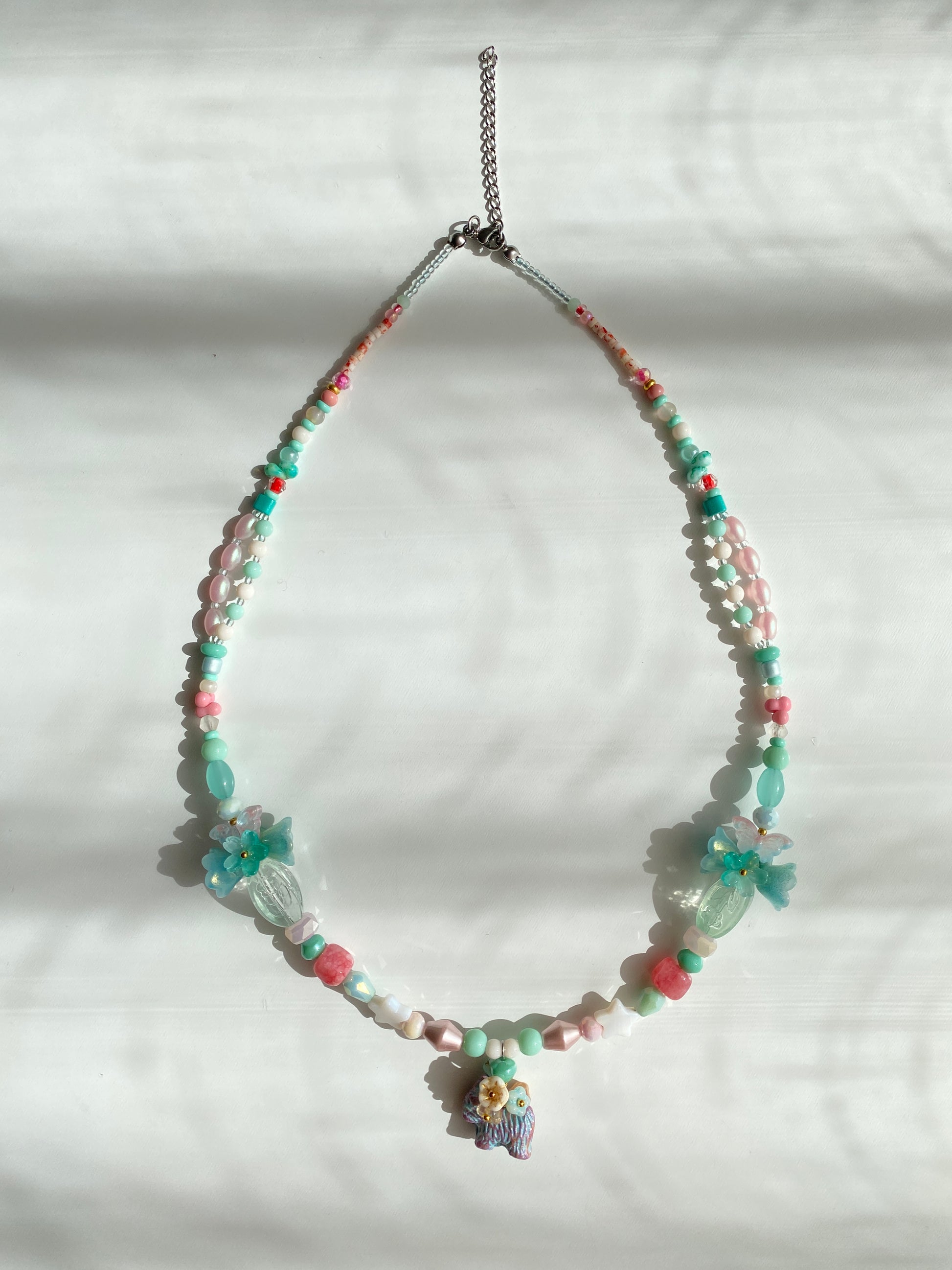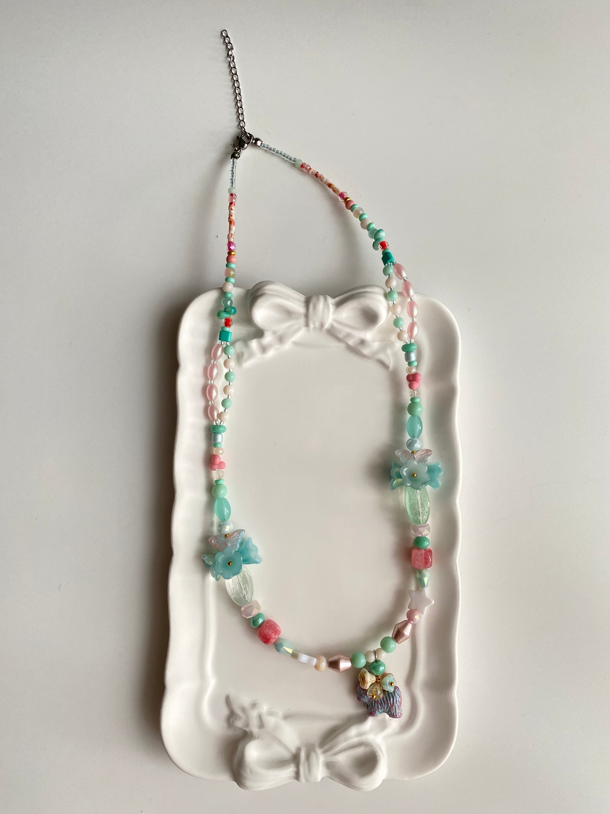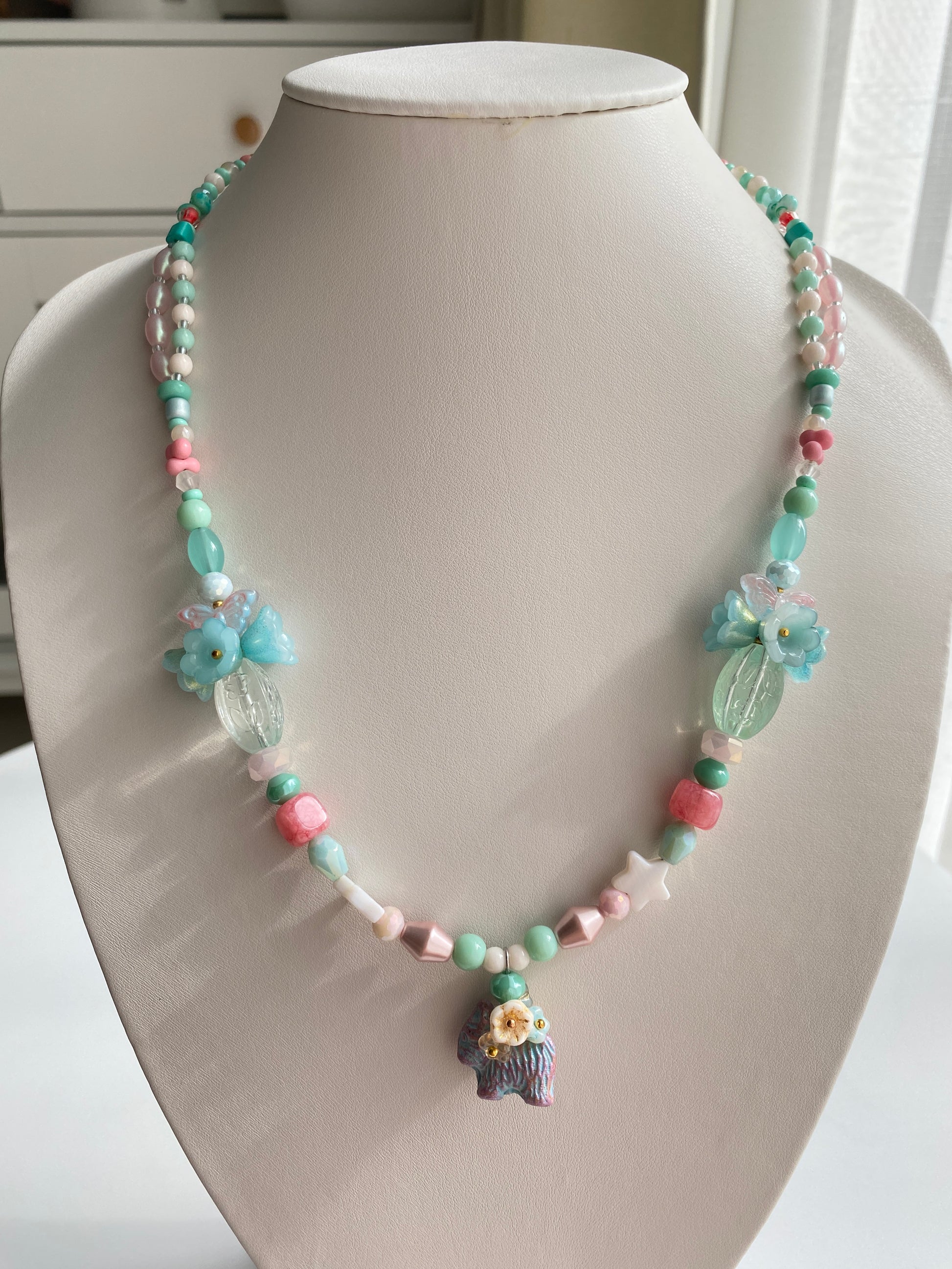 Playful Long Necklace with Cute Puppy and Flower Bouquet Motifs